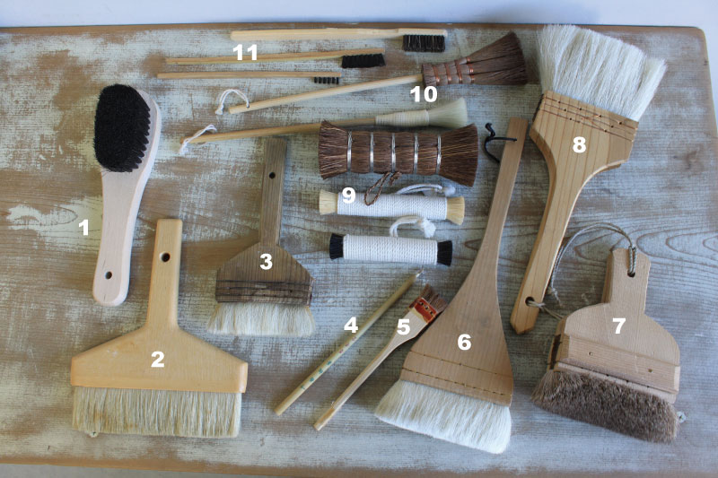 Originally for luster of wood, where there is a need for strong rubbing. - Small broom from the top: hemp palm and pig’s hair