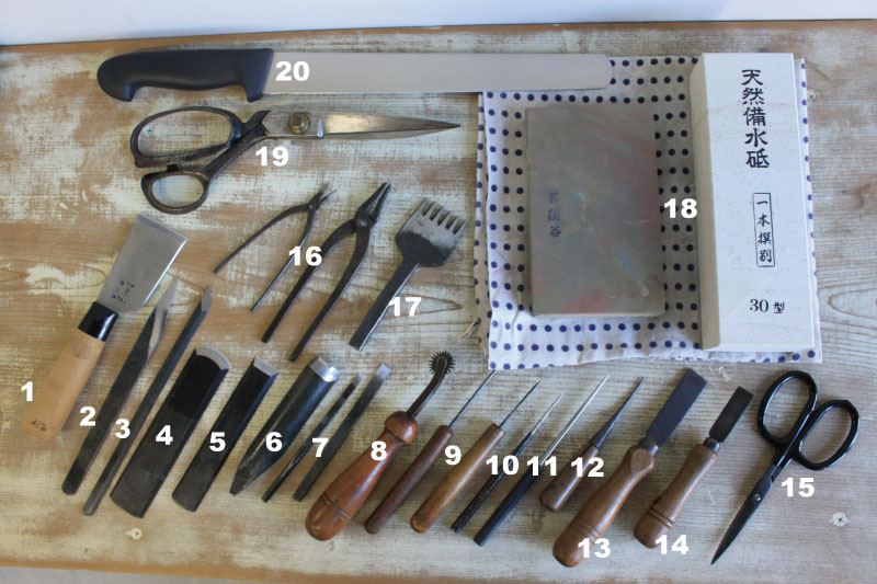 Use to thin the cover leather. It was originally used for carving Buddhist statutes. - Leather paring knife (straight blade)